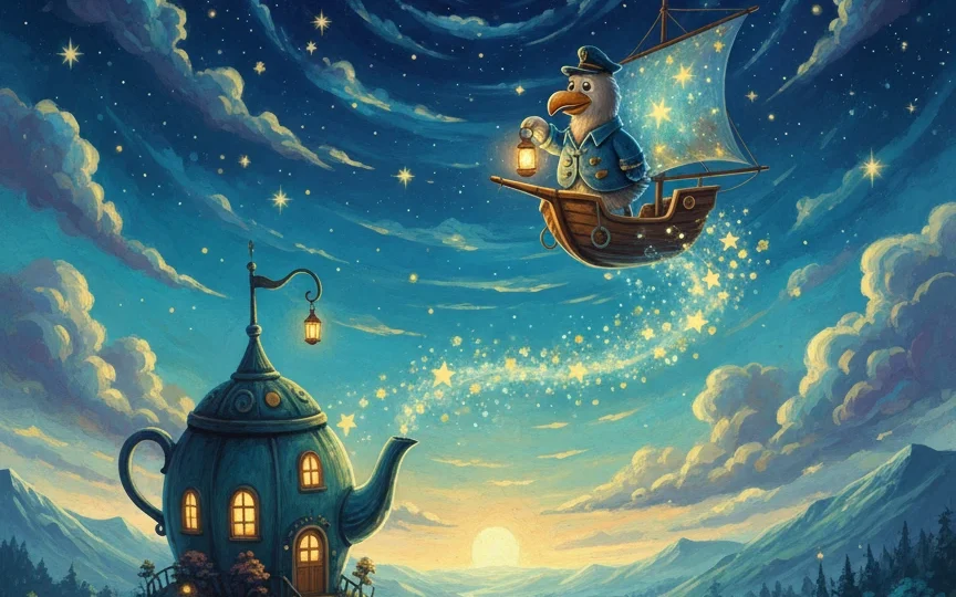 La création du bateau est un moment de poésie pure. Le pliage de la feuille, accompagné de petites onomatopées douces (« Frou-frou », « Plic », « Ploc »), agit comme une berceuse. Mais la véritable trouvaille réside dans l’envol du bateau. Contrairement à un navire classique, le Bateau des Étoiles ne navigue pas sur l’eau, il s’élève dans les airs, soutenu par des flocons de brume. Cette ascension lente vers le ciel étoilé est une métaphore parfaite de l’endormissement. En suivant l’ascension de ce navire de papier, l’enfant glisse lui aussi, progressivement et en toute confiance, vers le pays des rêves.